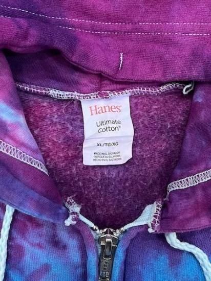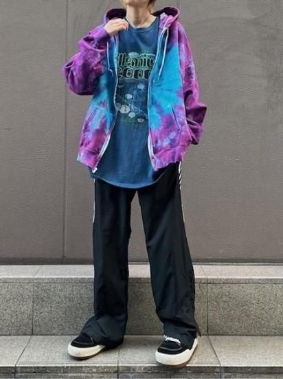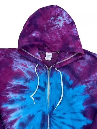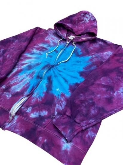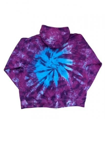 パープルとターコイズのタイダイが綺麗なカラーリングでかっこいいジップアップフーディ。